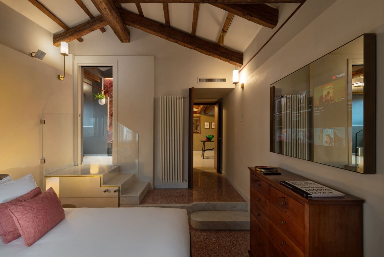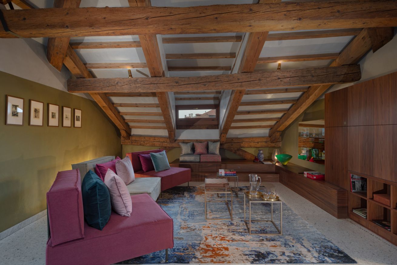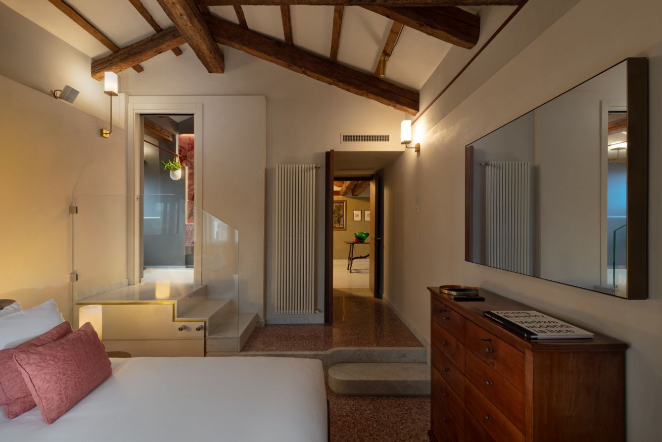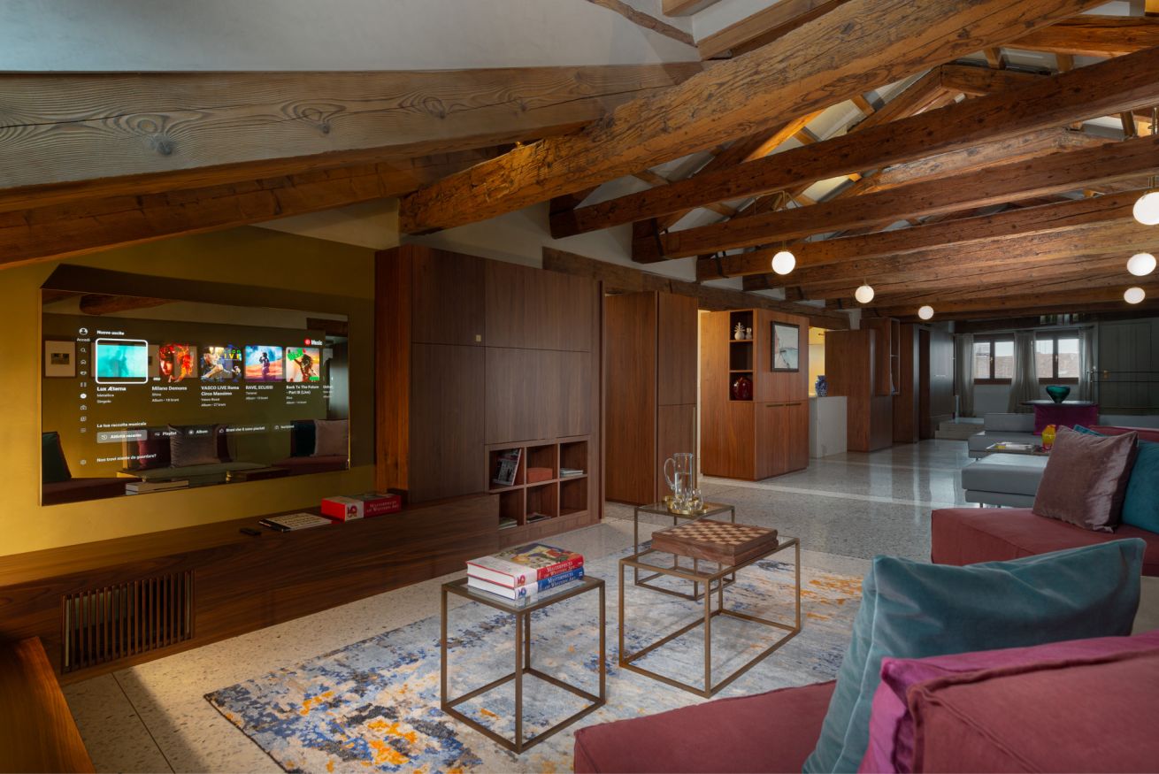 Located on the top floor of an important historic palace on the Grand Canal, with private water access, Altana is an ultra modern spacious apartment of around 170 sq.m with three bedrooms and four bathrooms. Large skylight windows bring in incredible light over the whole apartment.