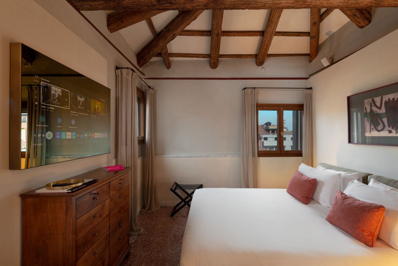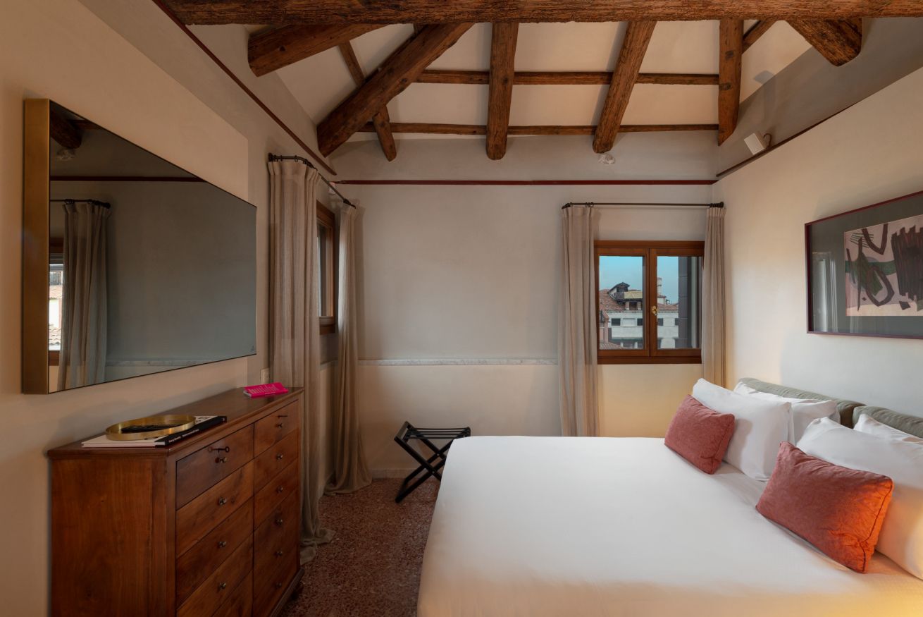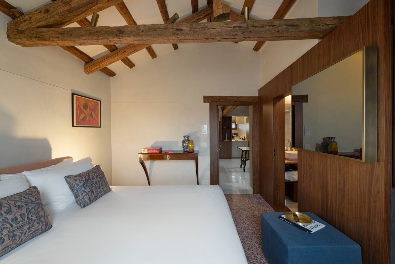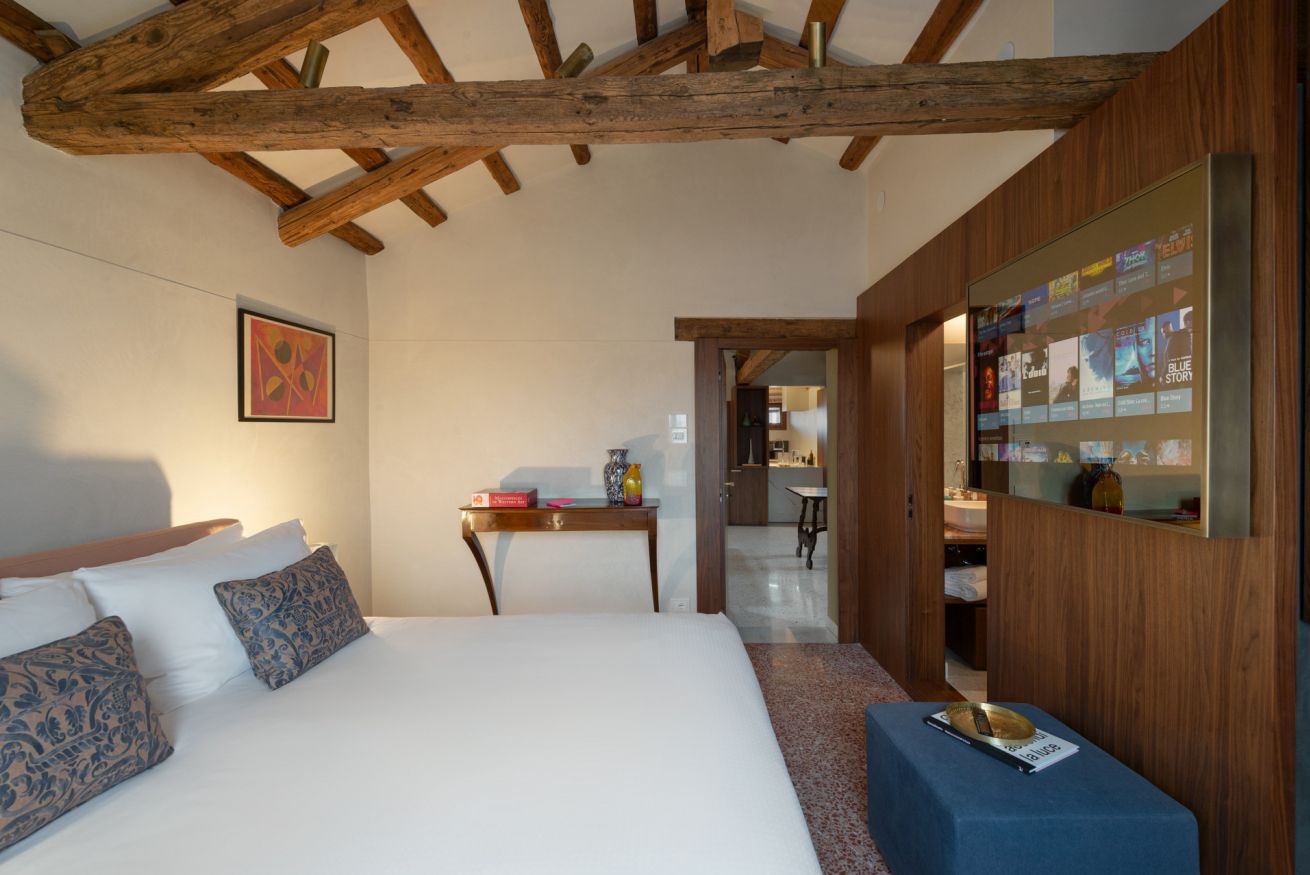 Located on the top floor of an important historic palace on the Grand Canal, with private water access, Altana is an ultra modern spacious apartment of around 170 sq.m with three bedrooms and four bathrooms. Large skylight windows bring in incredible light over the whole apartment.