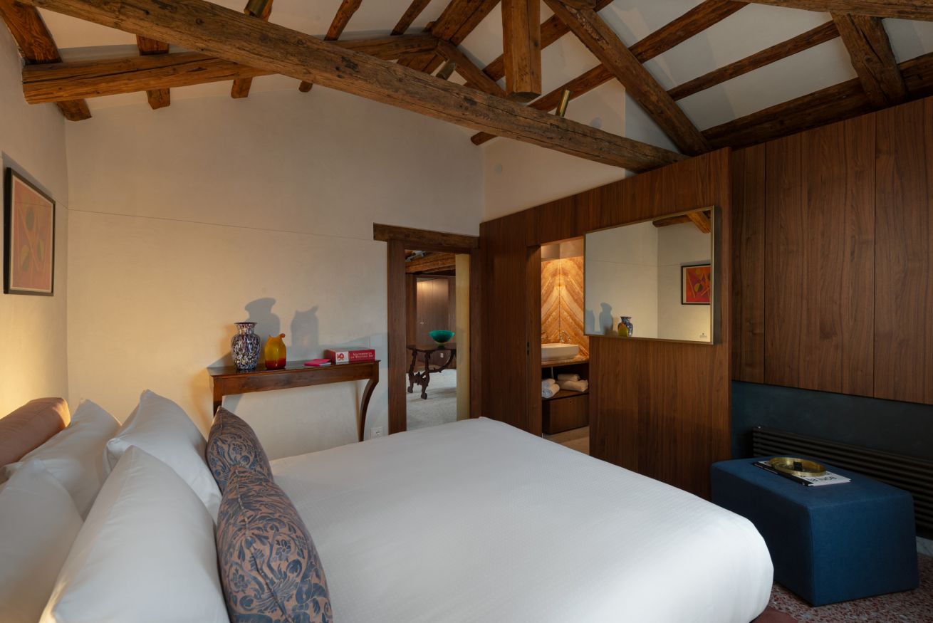 The slick interior is both elegant and modern - with oversized couches overlaid with Fortuny cushions in an array of colours, precious antique pieces, and large glass vases by Venini serving as an incredible backdrop to a super chilled design home-away-from-home.