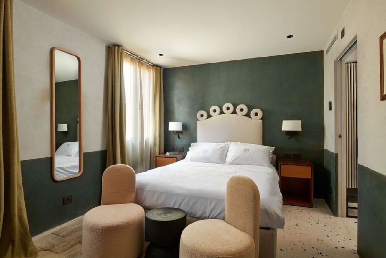 The double en-suite bedroom has Italian terrazzo flooring, Venetian stucco walls in taupe and dark green, and natural linen curtains. The comfortable bed has bespoke headboard baroque motifs inspired by the amazing Venetian skyline