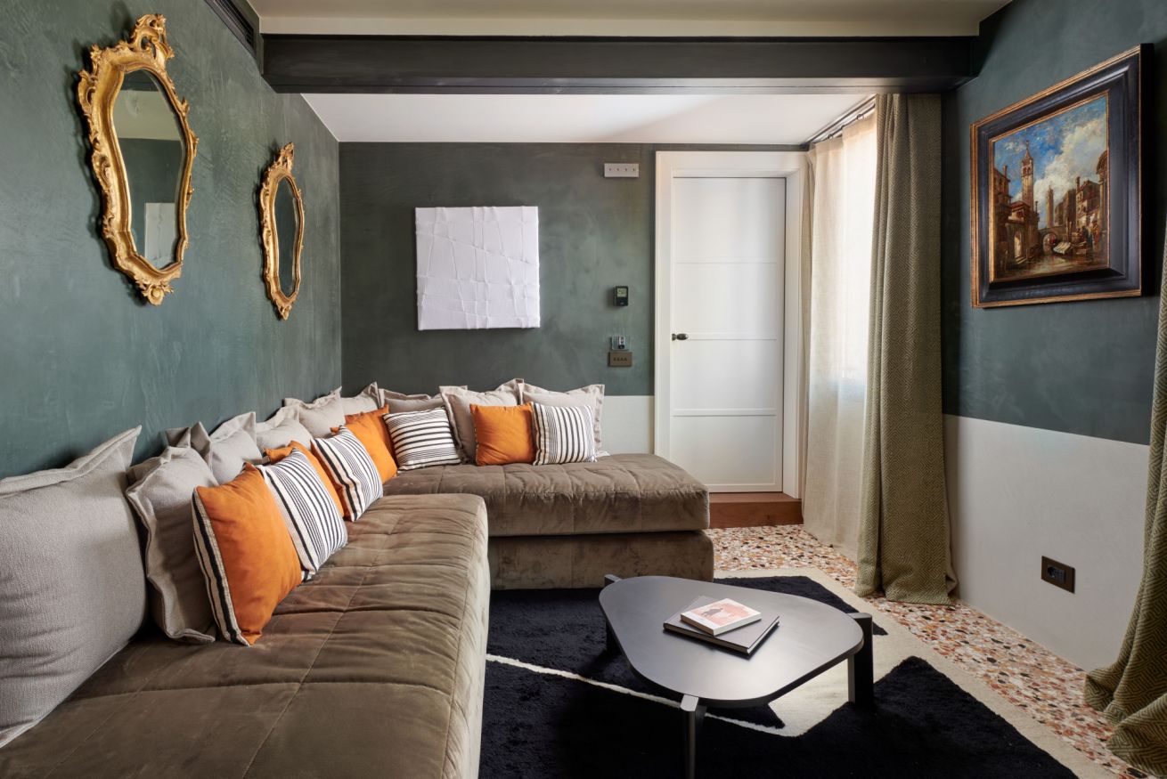 The living room is stylishly furnished with two huge sofas / beds in a luxurious marron velvet, complemented by vibrant orange and beige cushions. The walls, in a distinctive deep blue green Venetian stucco, are quite unique. Awe-inspiring views of Venice's rooftops from above...fascinating!