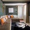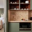 The kitchen area, with gorgeous bespoke olive green cabinets and Italian marble backsplash, meets all culinary needs with a complete set of cutlery and crockery. The marble bathroom has a spacious rain shower, a suspended sink, and an exquisite Ortigia vanity set.