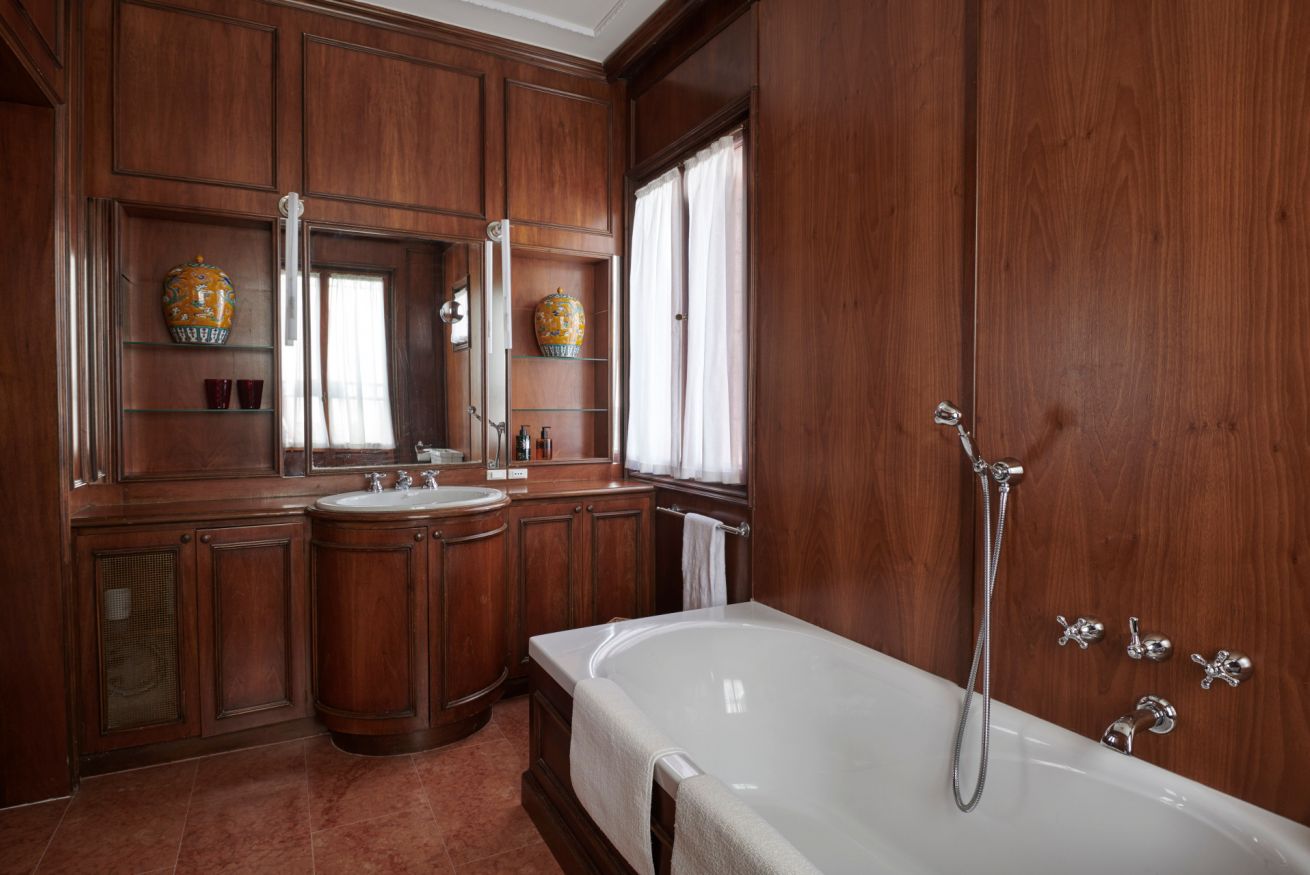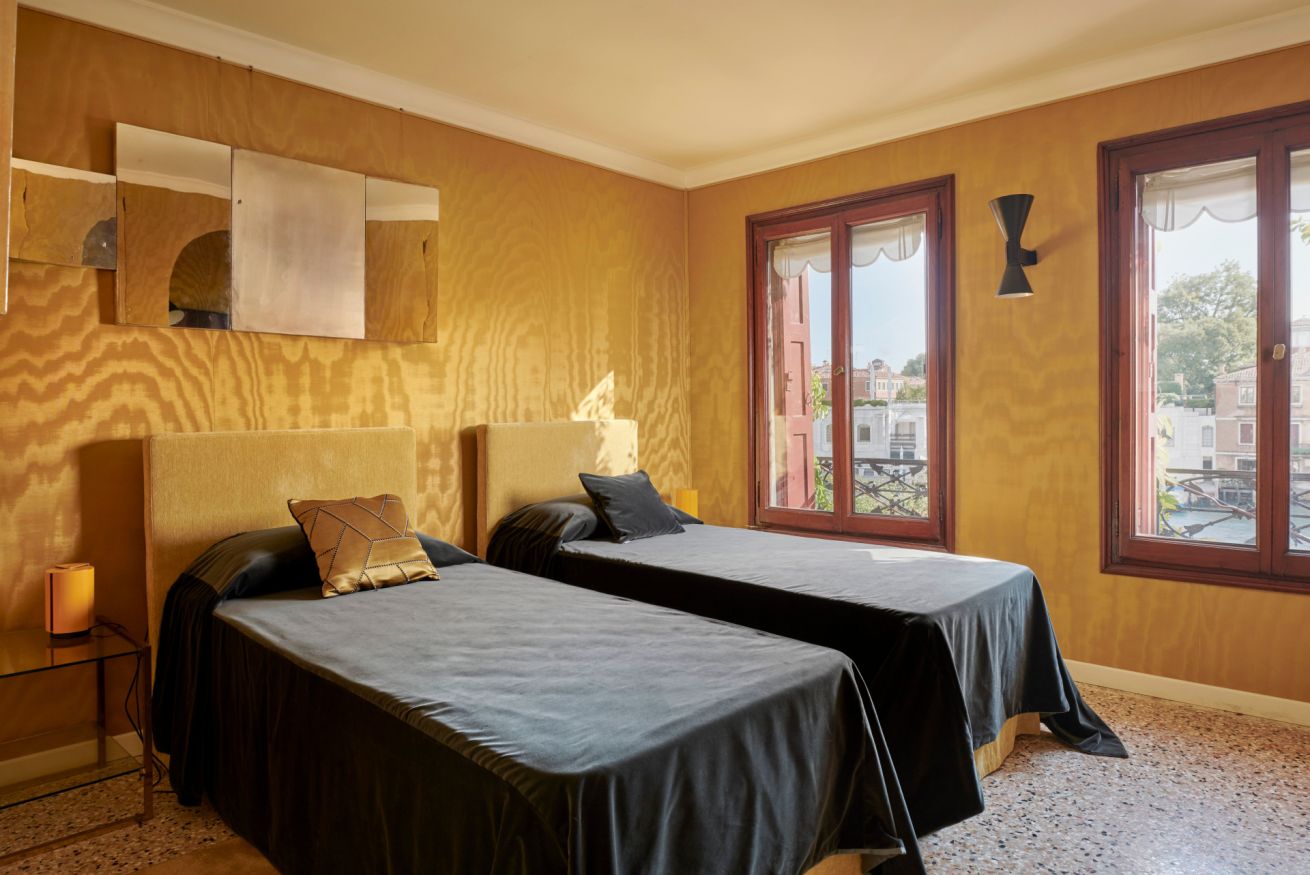 Two double bedrooms are situated on the first floor - A master en-suite bedroom with bathtub and a second double bedroom with adjoining bathroom with shower in Carrara marble. Both have generous views onto the garden and Grand Canal.