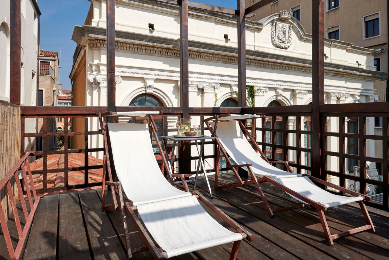Two further bedrooms: a double en-suite bedroom (with tub) and a twin room with cozy sitting area and adjoining bathroom with shower. An external staircase leads to an 'altana' (Venetian terrace) equipped with sun loungers.