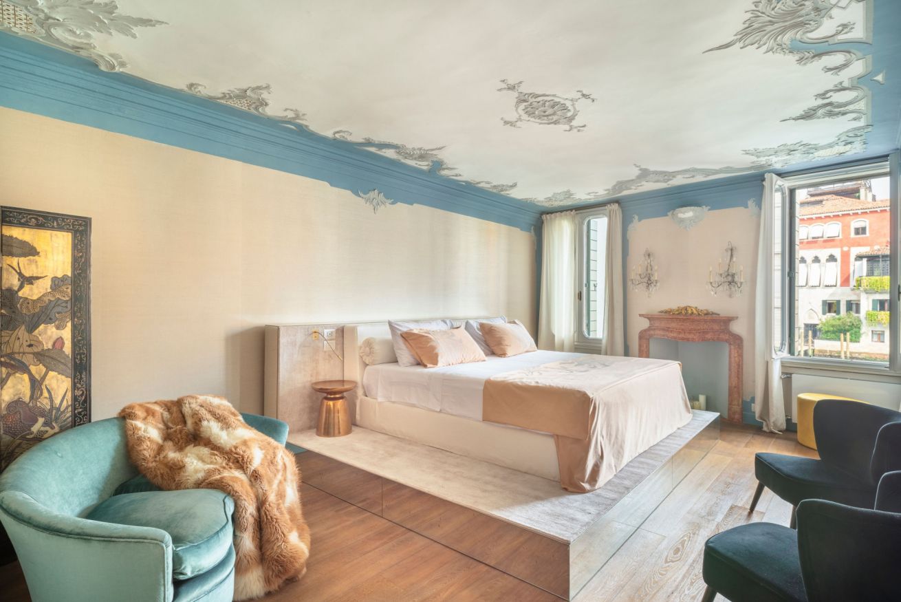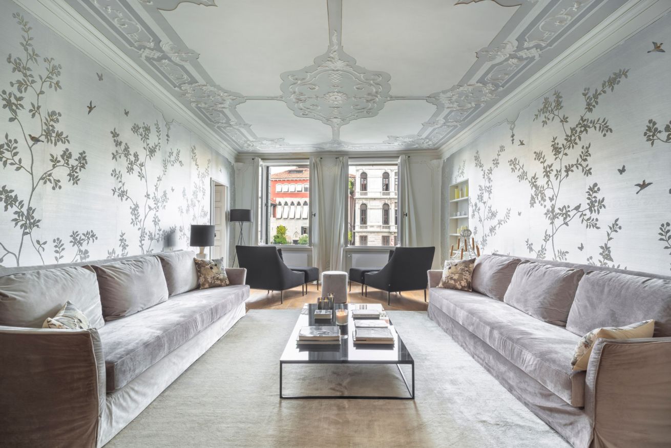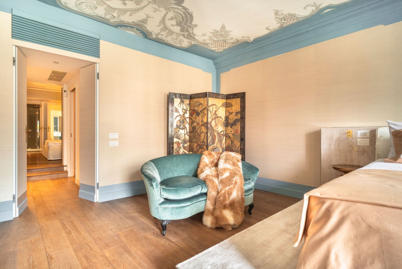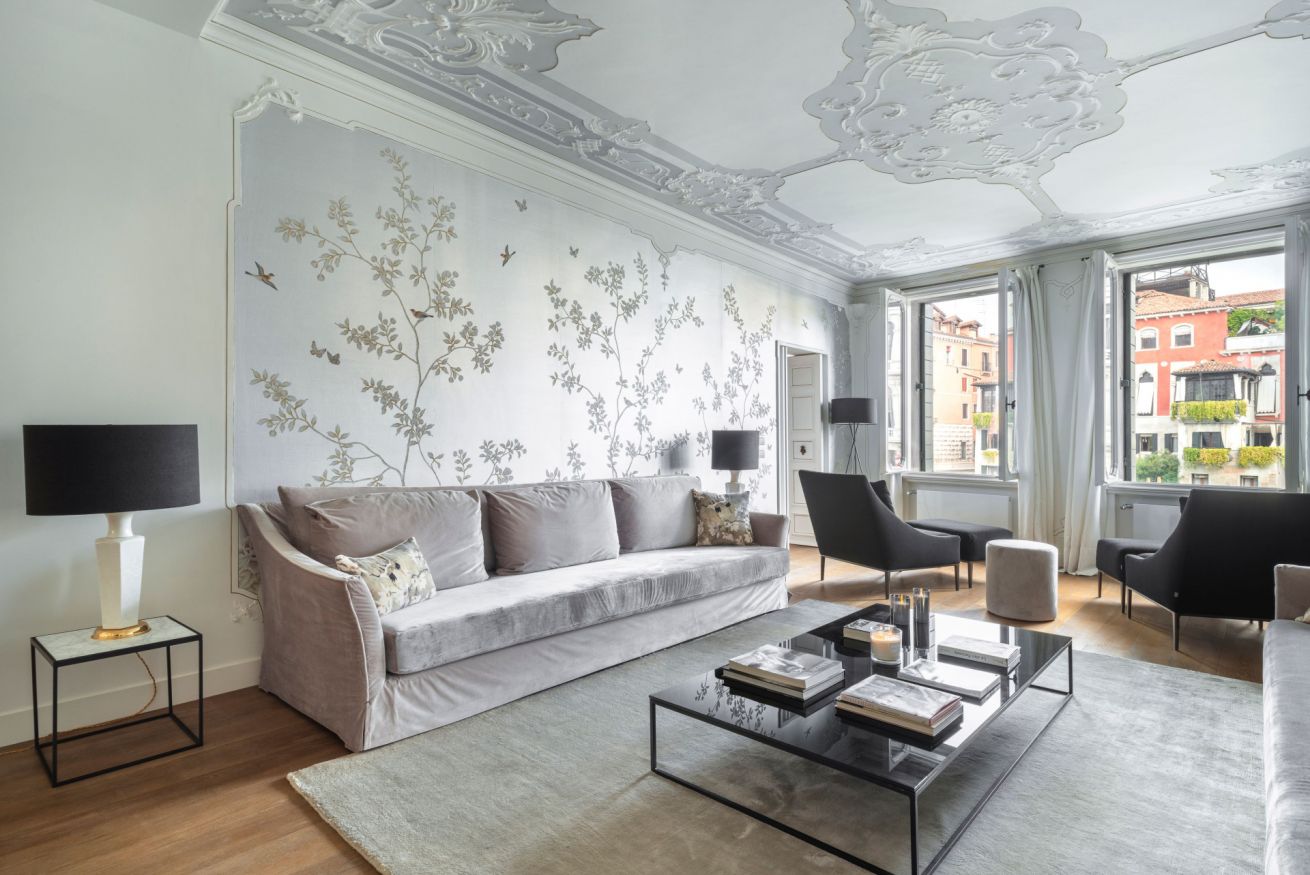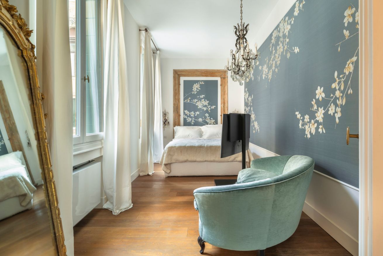 Design notes: Decorated in a sophisticated contemporary style with warmlight colours and comfortable furnishings, with walls adorned with exquisite silk wallpaper, and accented by original Venetian stuccoes, the whole decor seamlessly blends modern and historical design elements.