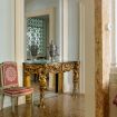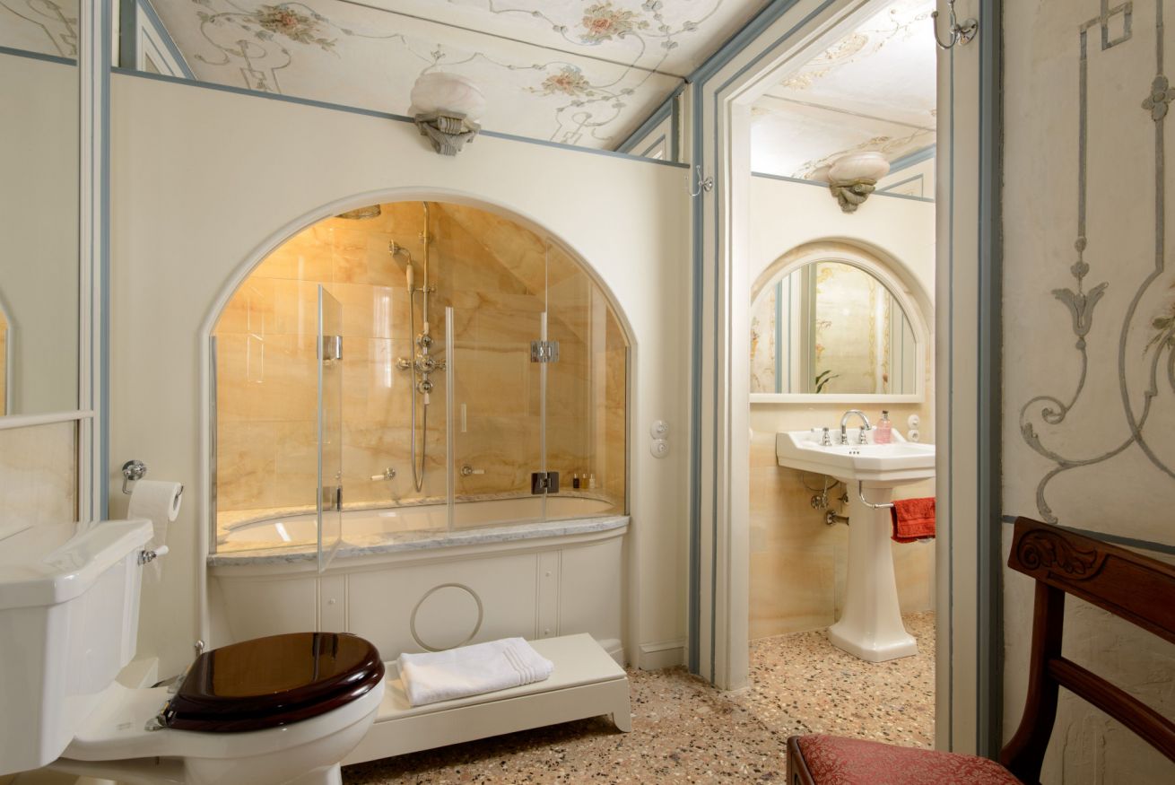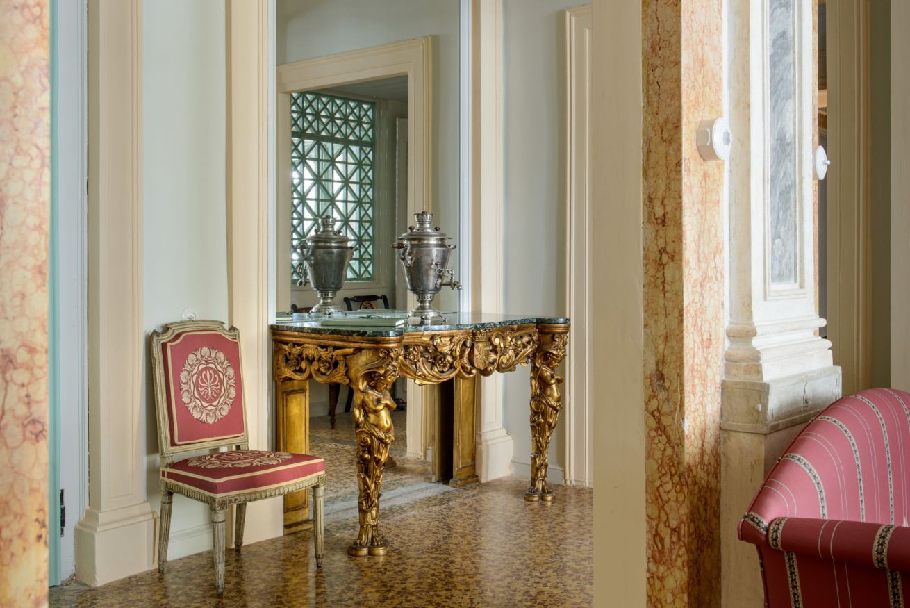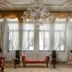 Behind the elegant and imposing white facade, two half flights of stairs lead to the apartment’s entrance. Two double doors open up onto a stunning central ballroom, with original stucco mouldings, delicately frescoed ceilings, and grandiose gilt mirrors. Six extensive French windows at the front of the room open onto a long balcony facing the lovely square and the Gritti Palace Hotel, while also enjoying Grand Canal views.