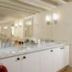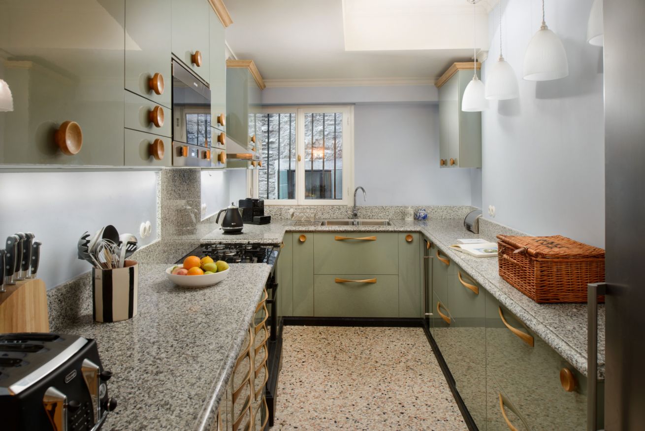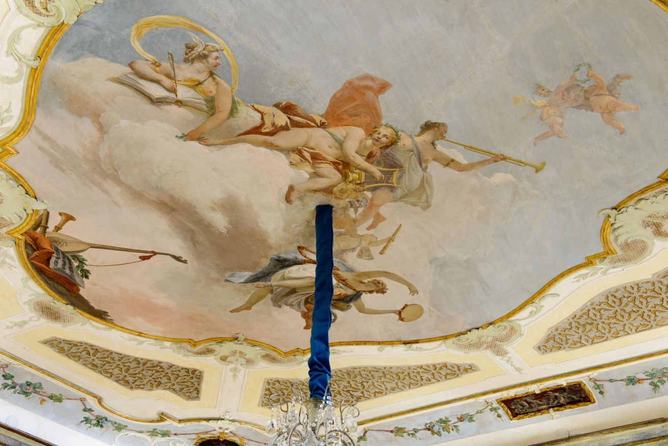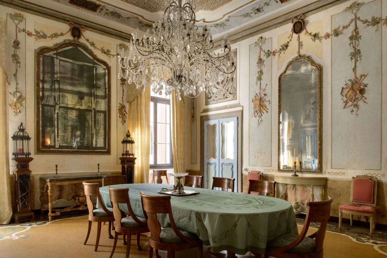 To the left of the central salon is the formal dining room with stately dinner table for ten (up to 14) and spectacular central Murano crystal chandelier. The original stuccoes showcase a variety of musical instruments, which points to the fact that this was almost certainly originally the music room, or sala della musica. From here, an intimate breakfast area leads to a very well equipped kitchen with sage-green cabinetry, and a guest powder room which is useful for invited friends to use.