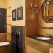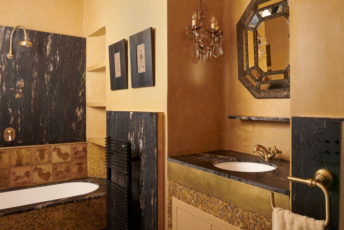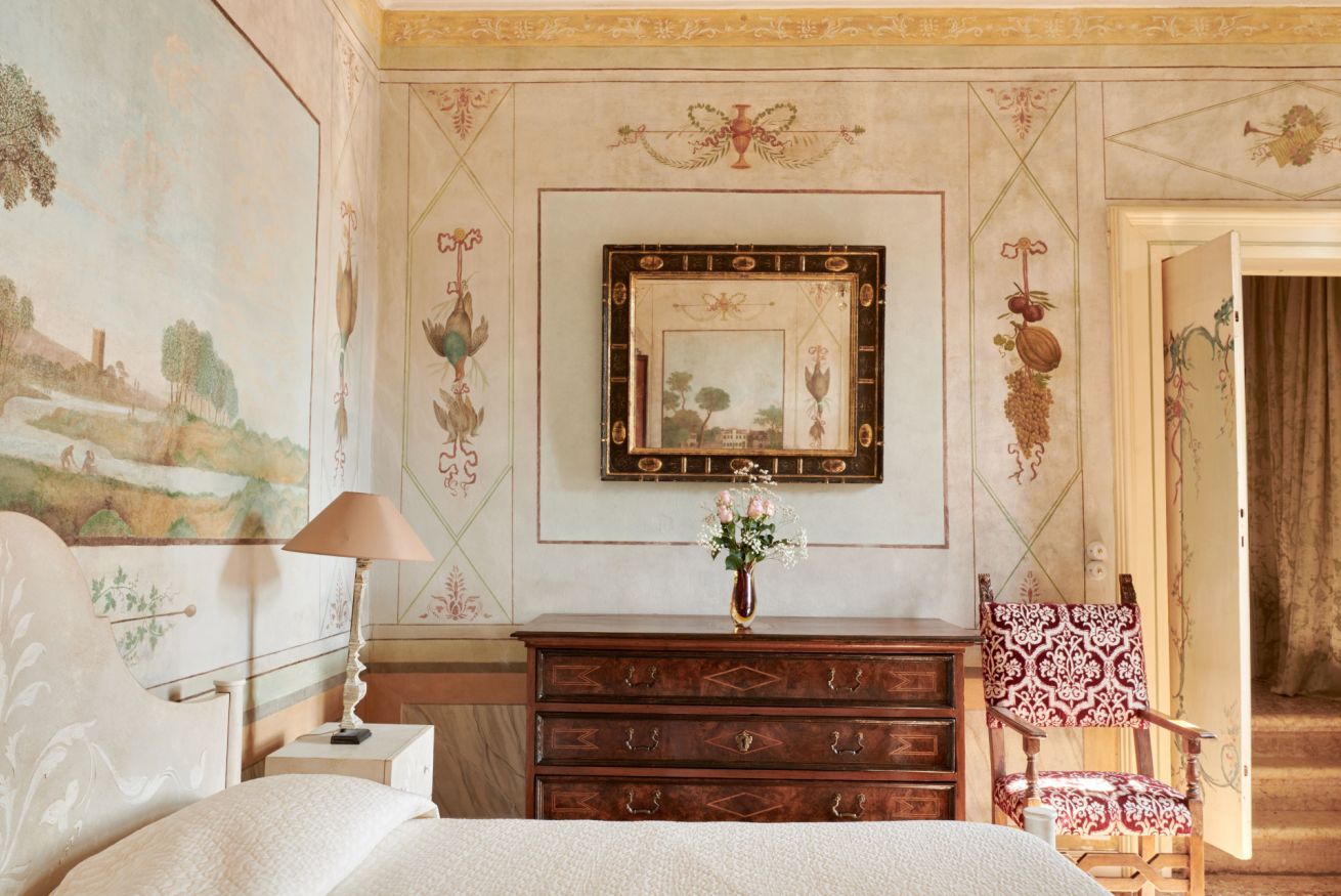 A light and airy bedroom with original fully restored pastoral frescoes and custom-made furnishings. The bespoke king-size bed from Porta Italia assures superior comfort and a highly enjoyable sleep experience. The master bathroom features a bath with shower, finished in beautiful dark striated marble and antique mosaics complementing the precious antique tiles by the famous Napoleone Martinuzzi who lived inthe palazzo at one time.