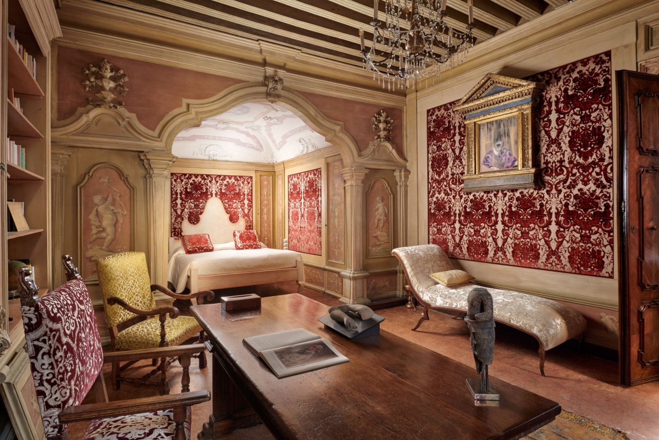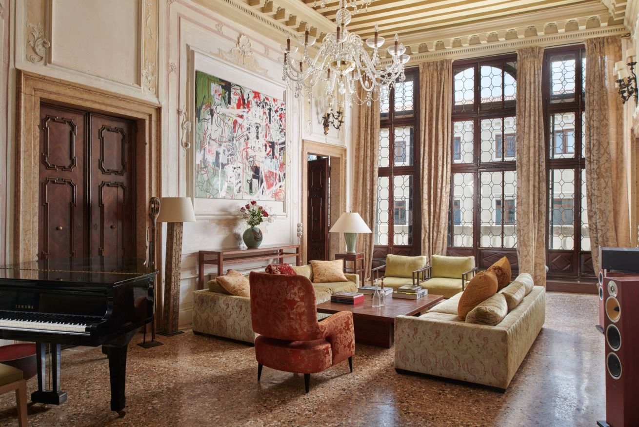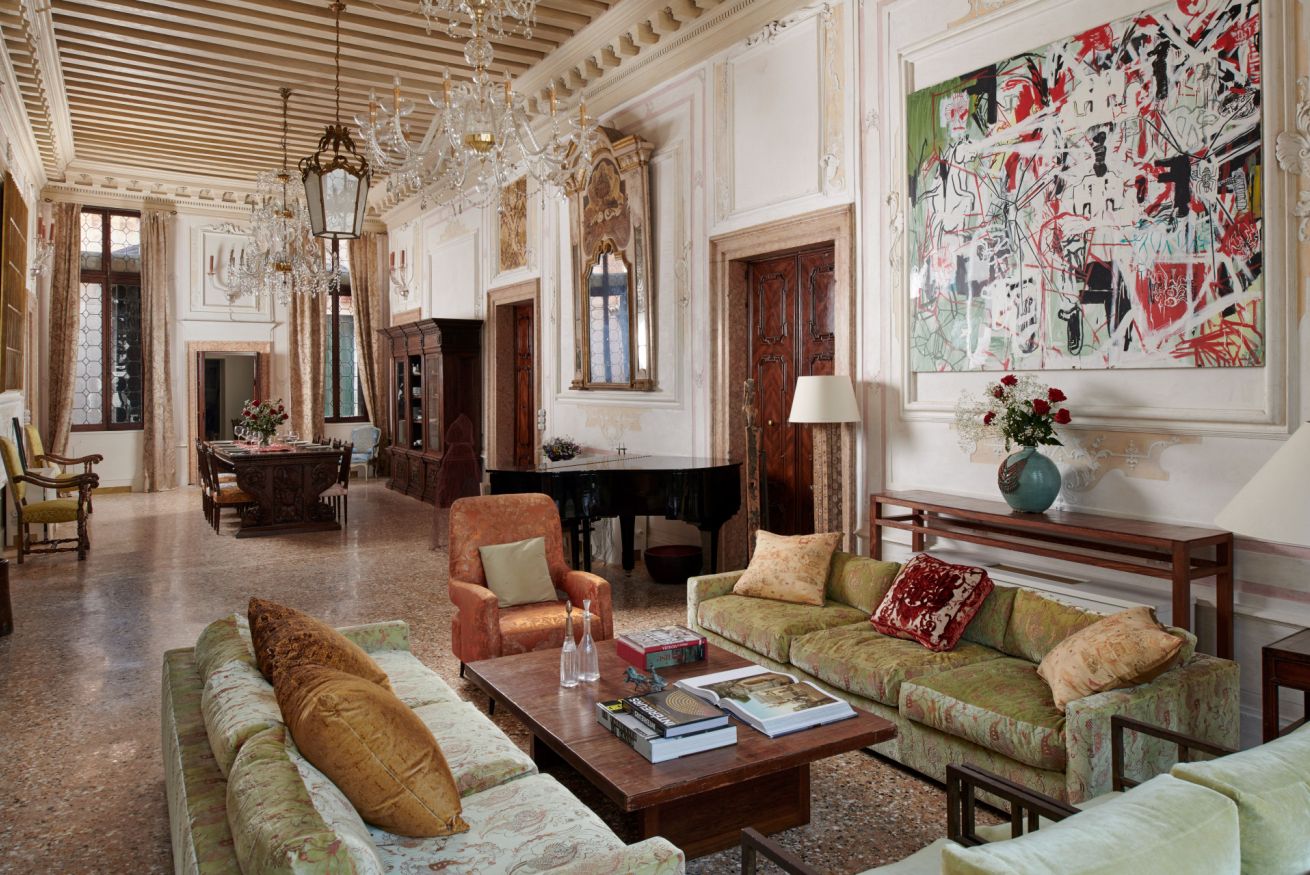 The furniture is an eclectic mix of period and contemporary pieces, with antique chandeliers and mirrors from Murano, France and Italy, in contrast with drapes by the Venetian textile-designer Rubelli.