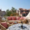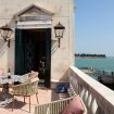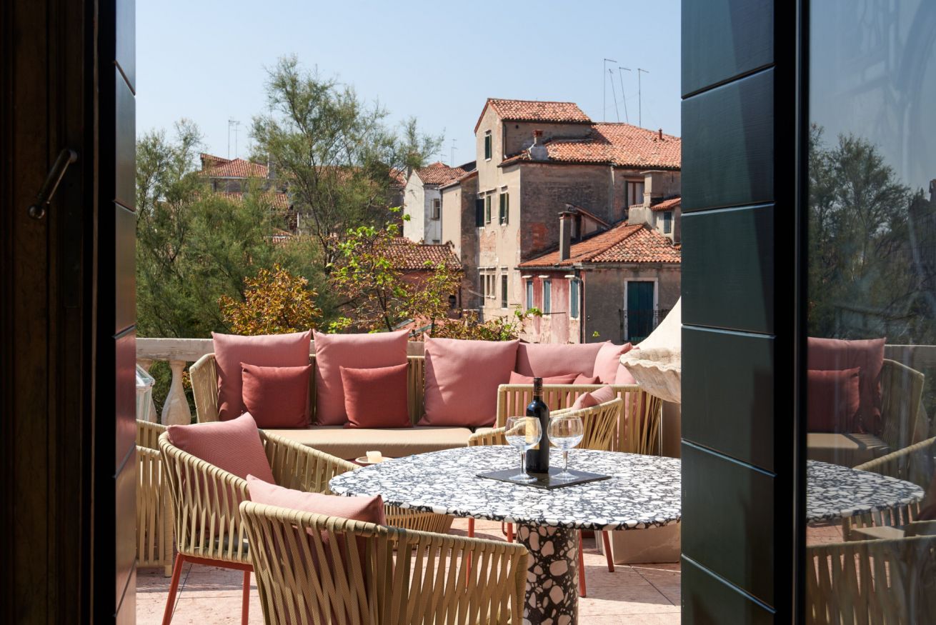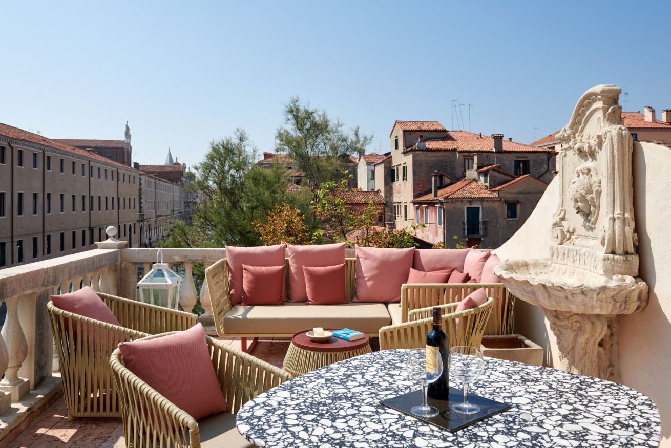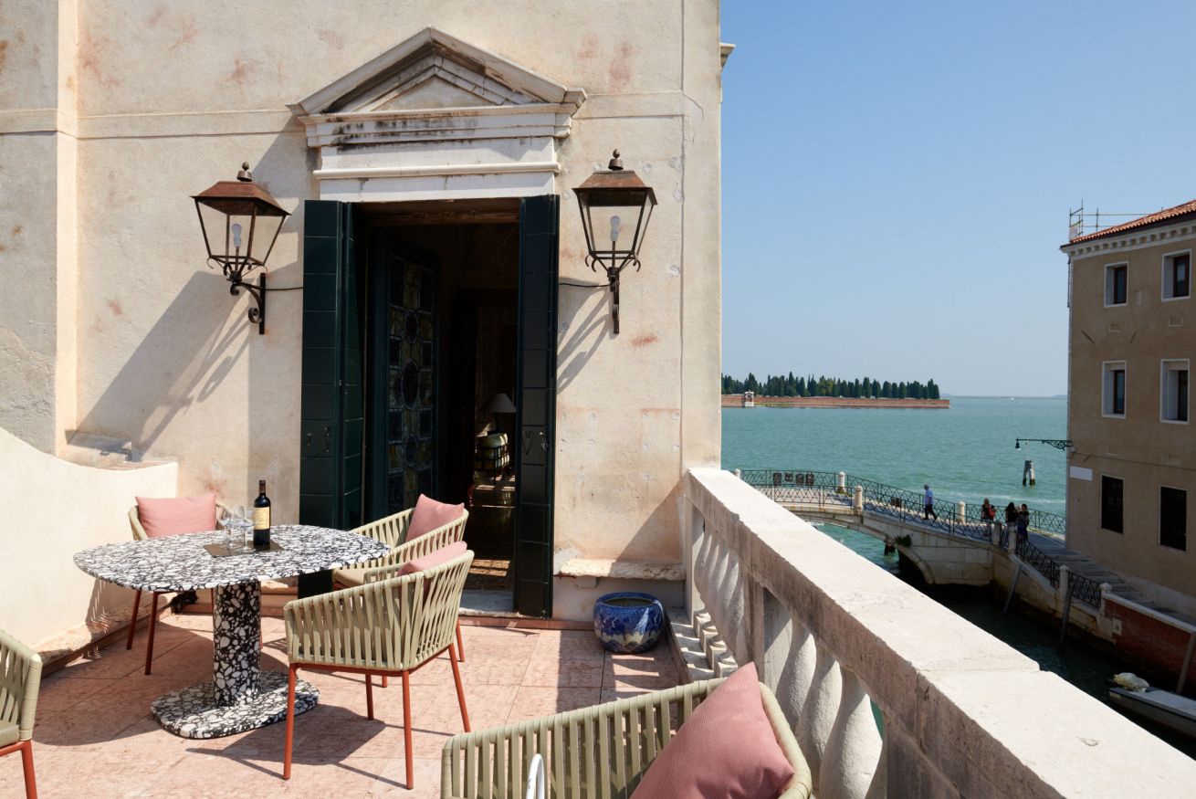 The fabulous terrace is accessed from the media room next to the main salon. Its door is a spectacular art-nouveau masterpiece by Murano artist Napoleone Martinuzzi. The large space is decorated with high-end furnishings by Kettal and boasts open canal views. An ancient stone fountain provides soothing water sounds, conducive to wine tasting meditation, or more simply just sunbathing en plein-air.