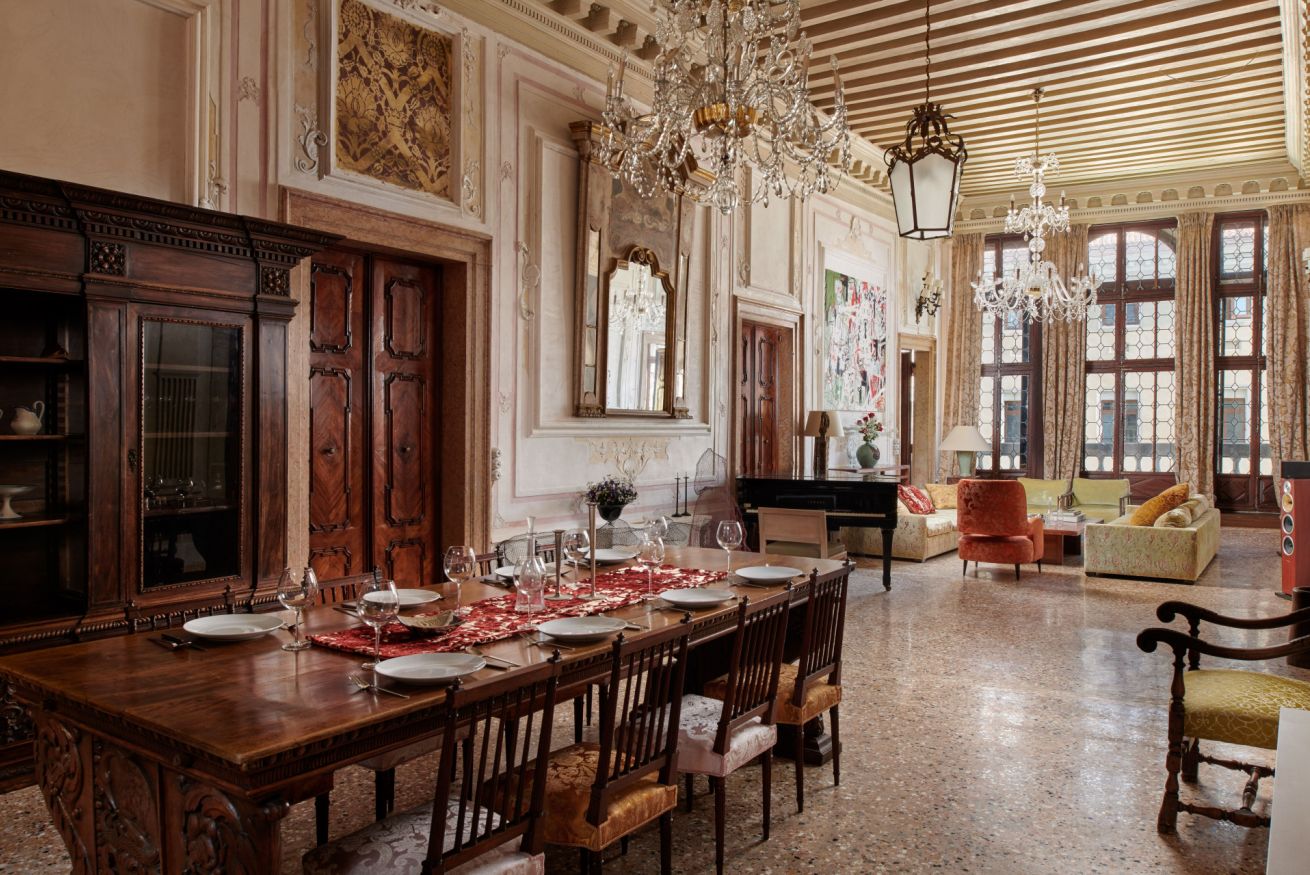 The elegant dining room flanks a modern kitchen with brass-clad cabinetry and features an antique dining table in solid oak and an original credenza from the historic Rubelli Grand Canal showroom. Artwork is by French artist Pierre Skira.
