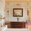 Showcasing an antique bureau from the Rubelli showroom, divine antique mirror wall-panels from France, and a beautiful freestanding bathtub, this bedroom is pure hedonism. The bed has been custom-made by Porte Italia.
