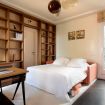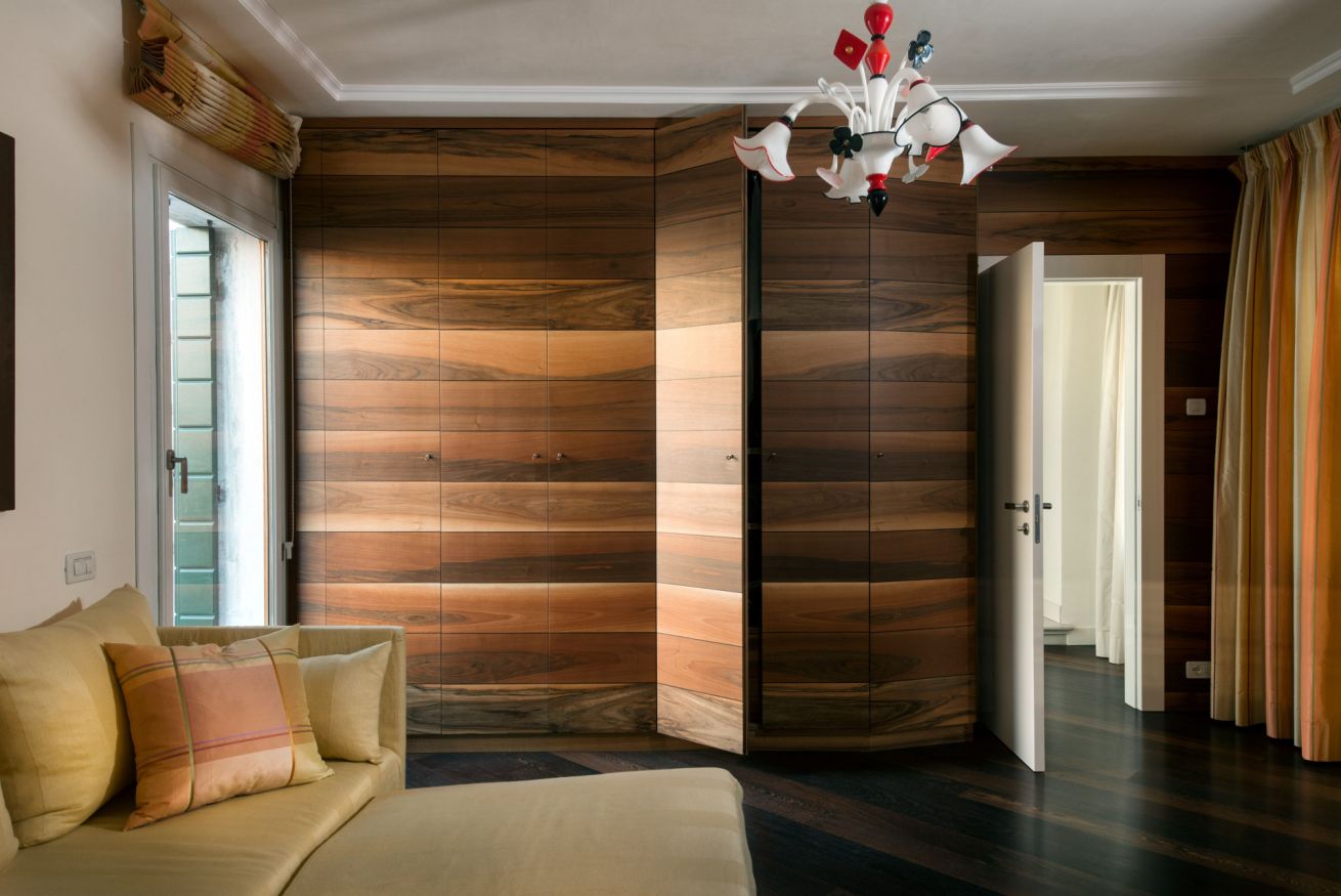 The guest bedroom is to the rear of the apartment. From here you can access the light and sunny terrace, which has stunning views of the Salute Church - a delightful place for long lazy lunches en plein air. The bedroom's cream coloured walls, made-to-measure mohogany cupboards and library create a cosy, extremely relaxed ambience. The queen bed, measuring 160cm, is comfortably made-up with superior linens and cushions. To the left is the en-suite bathroom and sauna.