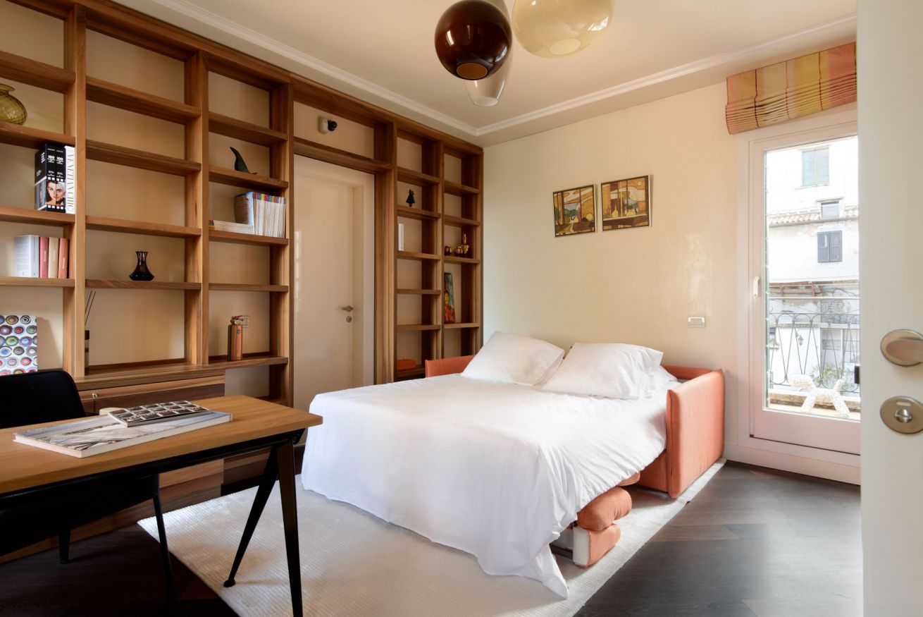 A large and very comfortable studio/ library, adjoins the living room, and also with wonderful canal views. From this south-facing vantage point the vista is absolutely amazing, across the gleaming canal waters towards the Redentore Church and the Basilica of San Giorgio Maggiore.